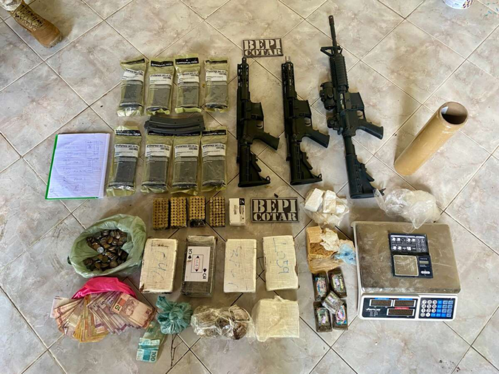 No endereço indicado, três fuzis, nove carregadores, 50 munições Cal.556, 50 munições Cal.380, 140 munições Cal.38, aparelhos celulares, balanças de precisão, uma quantidade de drogas e uma quantia em dinheiro foram apreendidos.