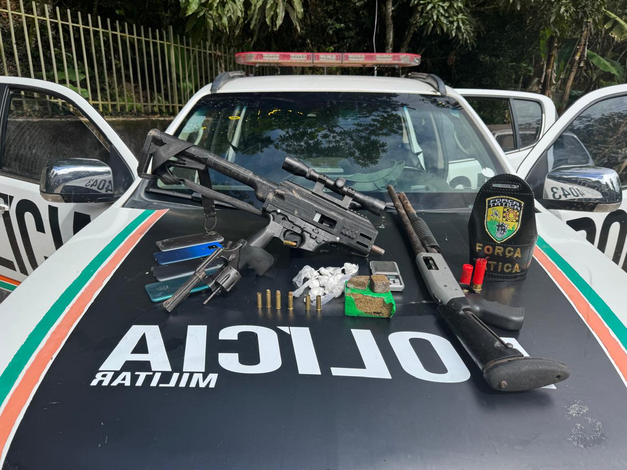 No local foram apreendidos 275 gramas de maconha, 18 gramas de cocaína, uma balança de precisão, quatro smartphones, um revólver calibre .38, uma espingarda calibre .12 da marca Boito, uma carabina 9mm, seis munições intactas de 9mm, três munições deflagradas e três intactas de calibre .38, além de uma munição calibre .12 deflagrada e uma intacta.