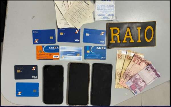 Durante a abordagem, um dos suspeitos tentou se desfazer de um extrato bancário com movimentações consideradas suspeitas. Na vistoria pessoal e no veículo utilizado pela dupla, um carro de cor branca, foram encontrados valores em espécie, diversos comprovantes de transações bancárias, cartões de diferentes titulares e aparelhos celulares.