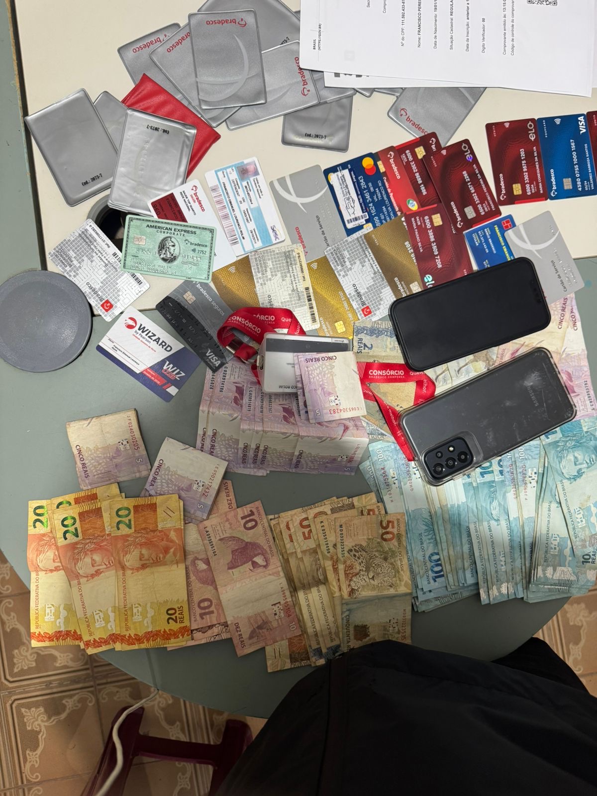 Após tomar conhecimento, na presente data (22/04/2026), da ativação fraudulenta de contas e da realização de saques, a equipe policial compareceu à agência bancária, onde deu voz de prisão ao suspeito. Ele foi flagrado em posse de R$ 7.746,00, além de diversos cartões magnéticos, dentre eles um vinculado à conta de um idoso, do qual havia sido realizado saque no mesmo dia.